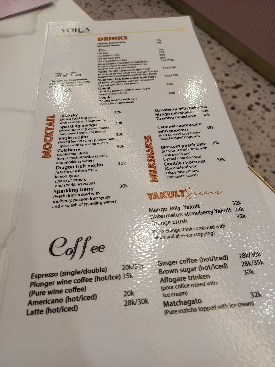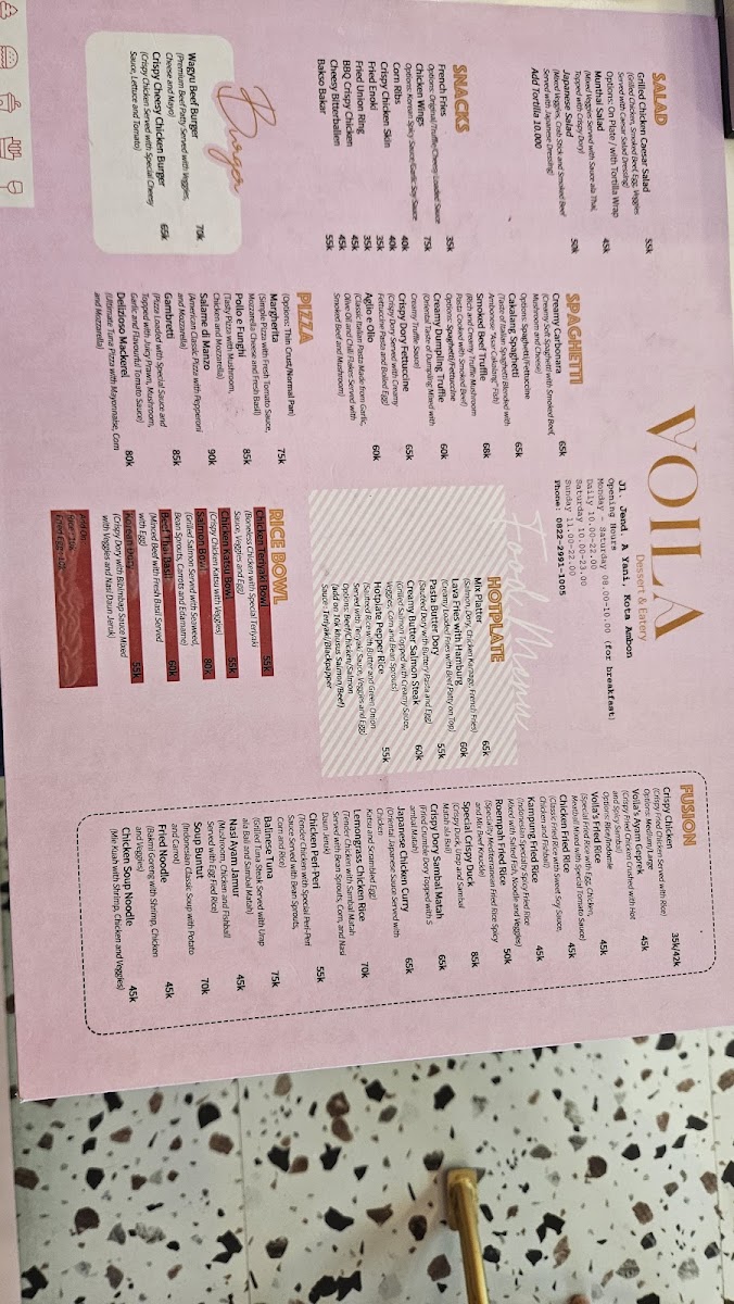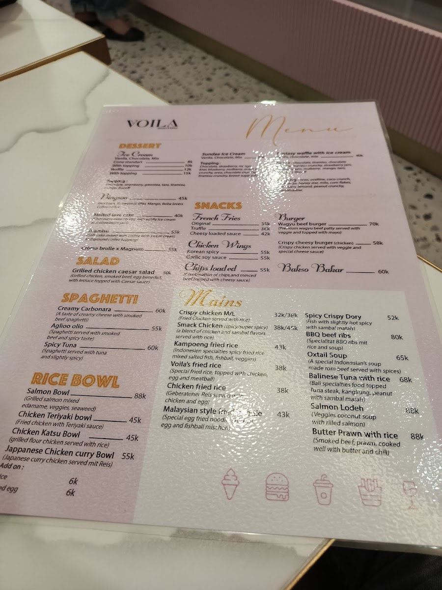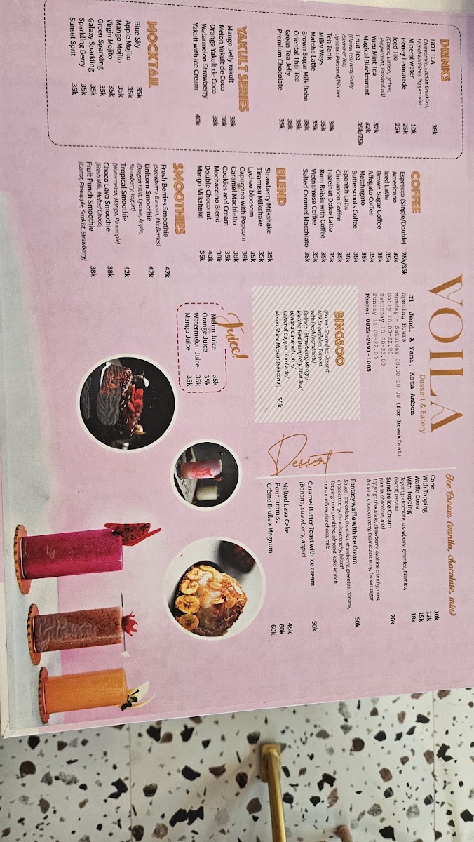 The menu at Voila Dessert & Eatery offers a range of food and beverage options suitable for casual dining, light meals, and coffee breaks. Visitors can find a selection of Indonesian dishes alongside Western-style choices as well as various desserts and drinks.